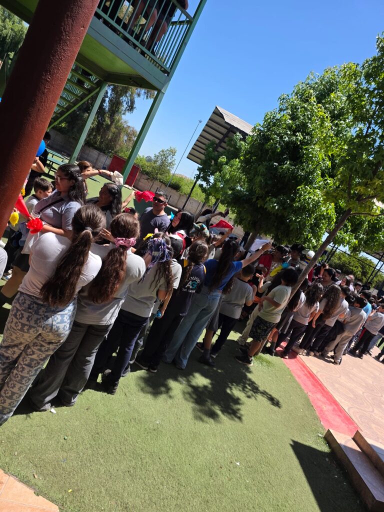 En ese instante culminante y aún con las vendas puestas, entraron los padres, madres de cada egresado, a cerrar este ciclo abrazándolos, tomándoles de la mano y caminar juntos, hacia la última parada… la entrada principal. Y fue ahí… cuando todos los cursos, literalmente todo el colegio, desde los primeros básicos hasta los terceros medios, docentes, asistentes de la educación, funcionarios y la dirección, formando una cadena viviente de aplausos de reconocimiento y buenas energías, que los egresados sintieron con mucha emoción, no pudiendo contenerse al ver las demostraciones de afecto, que llenó cada rincón y cada espacio del Colegio que los vio crecer. Al finalizar y ya saliendo del recinto, otra sorpresa los aguardaba: Las familias reunidas en el portón de salida, coreando y cantando en un solo corazón, mientras la batucada marcaba ritmo de esta celebración, invadiendo el aire de emotividad, orgullo y celebración.